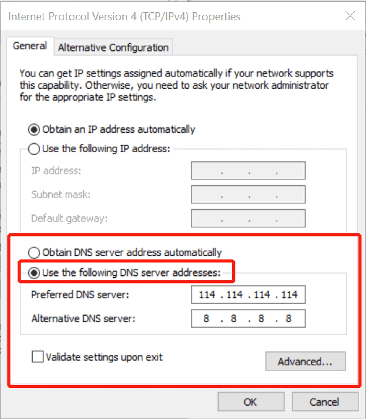 Check "Use the following CNS server addresses:" and enter the DNS server address as shown in the picture.