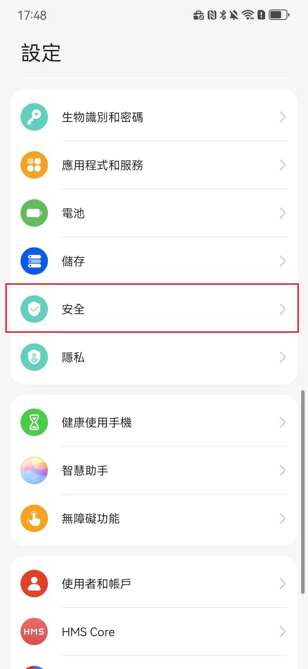設定 → 生物識別和安全 → 安裝未知應用 → 選擇來源應用 → 開啟允許