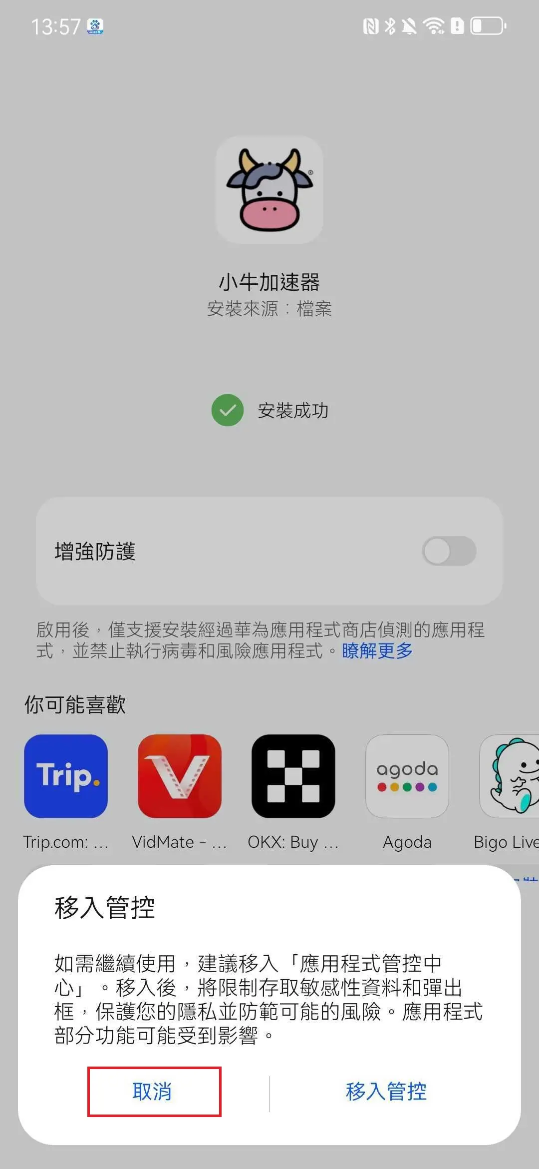 在移入管控彈窗中點擊「取消」。